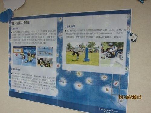 2013年04月22日到04月29日,台北厂及总部共同举办“eye的帮帮盲”系列活动,共有284位同仁热情参与,包含认知、体验、关怀行动三个面向。其中,在认知的部分,举行了“帮盲小知识”和电影欣赏。“帮盲小知识”的单元中,让同仁了解视障特性的分类、学习如何引导盲人行走的方法、导盲犬和盲人运动等相关知识,其中大家对盲人运动最感新奇,他们虽然看不见,但依然能利用听觉与一般人一样进行运动比赛,争取运动员的荣耀。透过小知识的展演,同仁们对盲人朋友的生活有更多的了解,也更珍惜眼睛健康的重要。