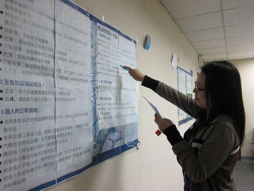 最令人印象深刻的莫过于体验活动。行进、折衣服、数算钱币和阅读,对一般人来说是再自然简单不过的几件小事,然而蒙上眼睛之后,原以为的轻而易举,竟然都有了大困难。经过体验活动的洗礼,大家对盲人自理生活的不便,及勇敢面对生活和人群的勇气都钦佩不已。总部更邀请爱盲基金会的志工为同仁进行讲座,包括照护盲人的经验分享,以及导盲杖、点字卡、阅读器、钞票辨识器等盲人生活辅具的使用教学。