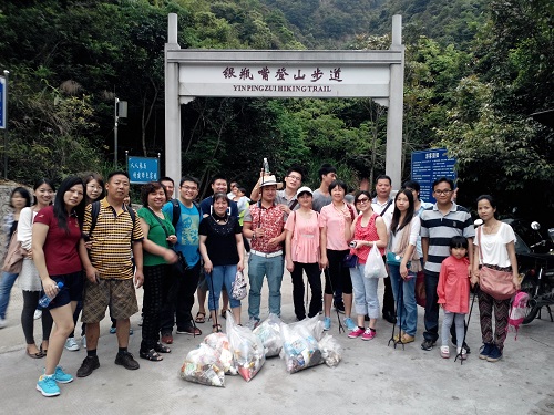 活動當天上午09:30到達水濂山森林公園,大家兩人一組紛紛領取垃圾袋、拾物器,共計70人參與淨山。銀瓶嘴山峰海拔898m,是東莞第一峰。淨山過程中大家充分發揮團隊精神,一人撐垃圾袋,一人持拾物器撿沿途的垃圾,同時兼顧欣賞沿途優美的風景。公園內其他遊客也受到了我們活動的感染,將自己消耗過的物品整理扔到垃圾桶裡,有的人甚至也參與到我們的活動當中,一同為這片旅遊區做綿力的貢獻。