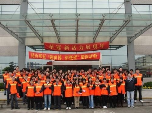 為了迎接2010上海世博會,建設綠色昆山,響應正美集團“綠行動”大串聯,昆山華冠於2010年04月22日世界地球日當天,在豐安小區及公司對面的小公園舉辦環保活動,清潔週邊環境。共有80名員工參加,在3個小時的活動中,清理出491.36公斤的垃圾(一般垃圾376.25公斤、可回收垃圾115.11公斤)。