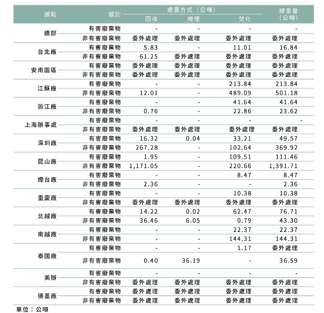 各營運據點,廢棄物處理委託合格合法的清運廠商進行廢棄物的運送,並透過供應商稽查體系定期追蹤,以確保廢棄物的清運符合當地區域法規的要求。